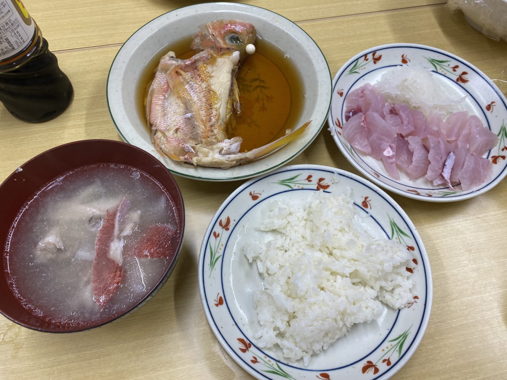 収穫が終わった後には、天気が良かったので釣りに行きました。あいにく魚は釣れなかったのですが、海と島を眺めながら釣竿を見ているのは不思議と飽きず、あっというまの2時間でした。また、漁帰りの島民の方からハマダイなど4匹いただき、津波古さんに鱗と内蔵の処理をしていただいたものを、煮つけ・刺身・あら汁に調理して豪華な夕食を楽しみました。