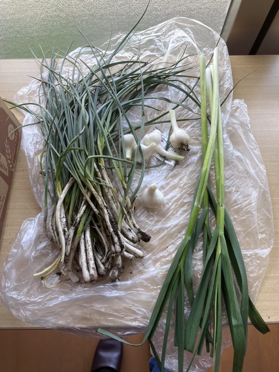 朝は津波古さんのらっきょう畑で、らっきょう収穫の体験をさせていただきました。草と球根の部分がちぎれないように、らっきょう全体を抜くのにはコツが必要だったので、最初は引き抜くのに時間がかかったり、草だけをちぎってしまうことが多く、「出荷できる状態の野菜」を準備することの大変さに気づきました。お昼休憩をはさんで2ターン目の収穫では、少しづつコツをつかむことができ、効率よく・ミスを少なくして収穫することができました。
