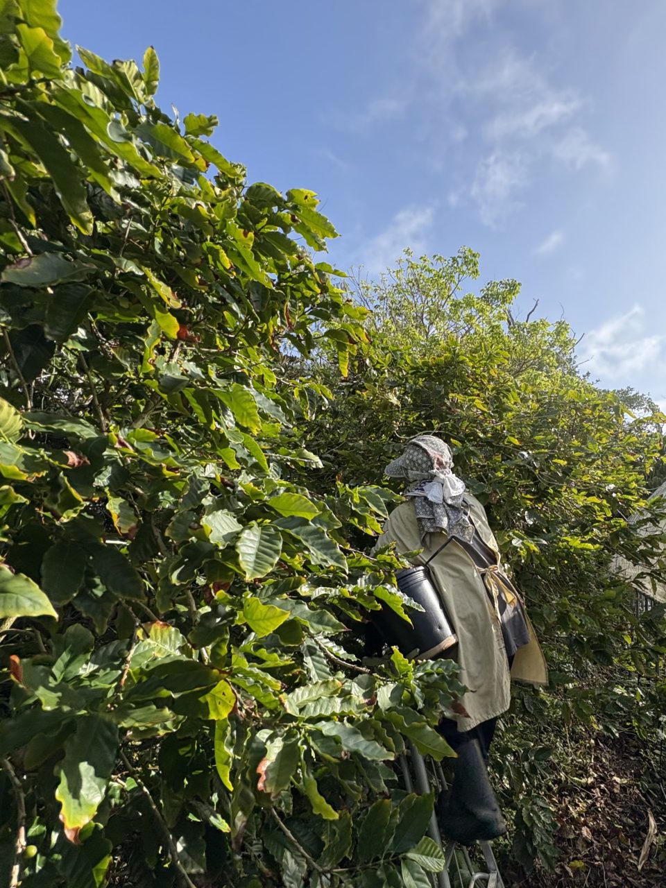 今日は栄農園さんでコーヒー豆の収穫、花の栽培の手入れをお手伝いさせていただきました。