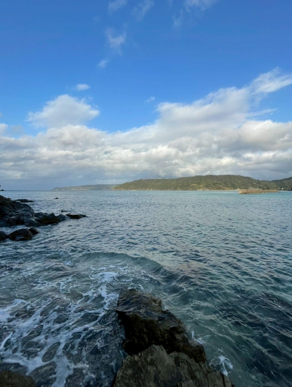 午後は晴れ、一行と海へ向かい、釣りや海岸散策に興じた。静かに波を立てる目の前の青い海が作り出す壮大な景色を楽しむとともに、その美麗さがいつまでも保てるように心がけていきたい。