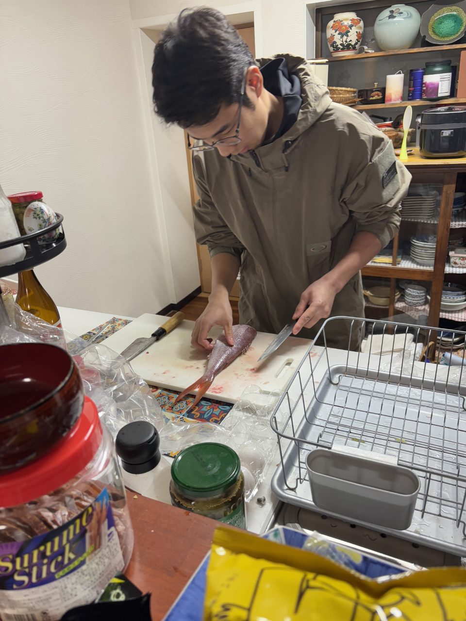 世話人の知り合いから魚(オジサン、チビキ)をいただきました!メンバーに魚を捌ける人がいたため、魚の捌き方を教えてもらいました!