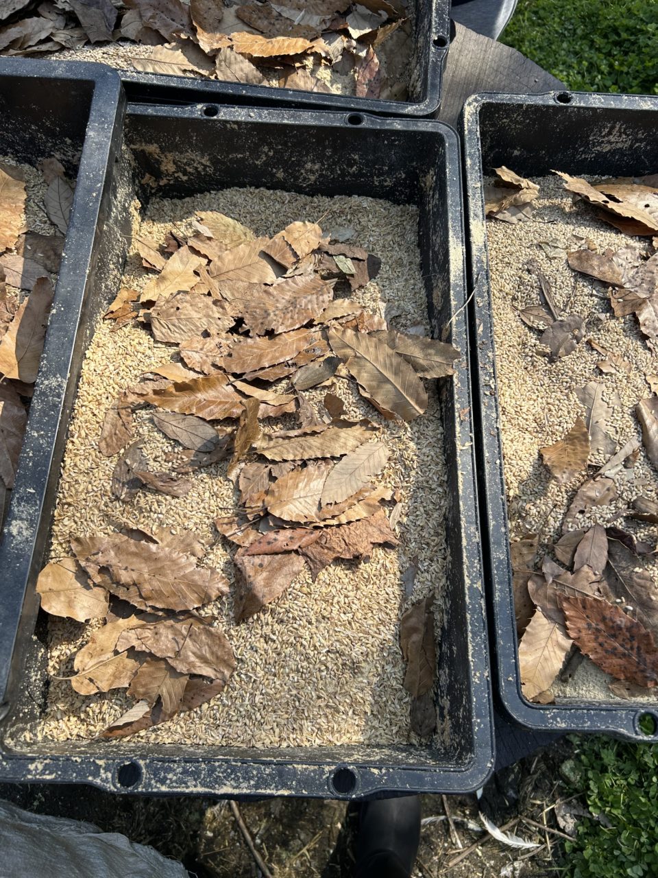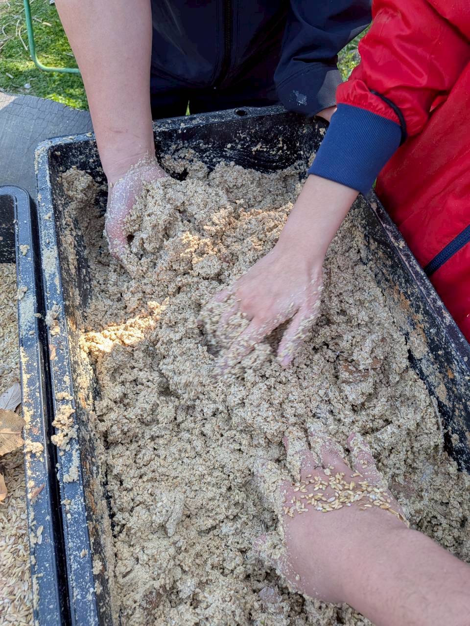 今日の活動は全員が集まり、午後から開始!ニワトリとヤギの餌を作りました。ヤギのえさではヘイキューブという固い乾燥させた草を砕き、食べられるサイズにしました。その次に、ぬかとくず米と落ち葉を水で混ぜ合わせ、みんなでもみました!