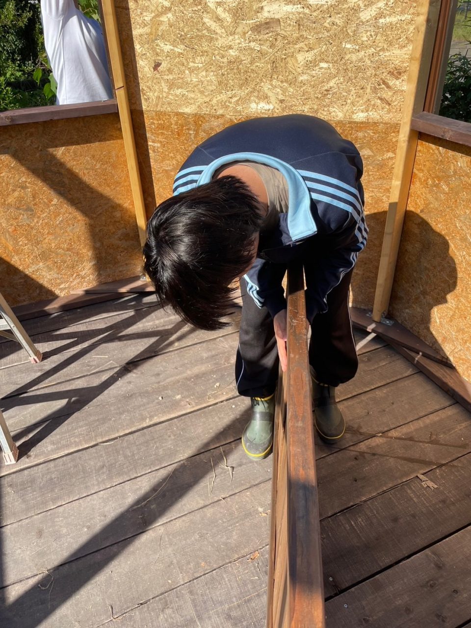 今日はドアとエアコンを取り付ける壁の作成を主に行いました。1.5メートル程度の板に垂直な線を引き、それに沿って切る作業は、一見真っ直ぐ引けているように見えても数ミリのズレがあったりし難しかったです。昨日取り付けた角材が取れてしまうというハプニングもあり工具を使った作業の難しさを学びました。木槌の頭が取れた場合の直し方やタイヤのパンクの修理の仕方なども教えていただきました!