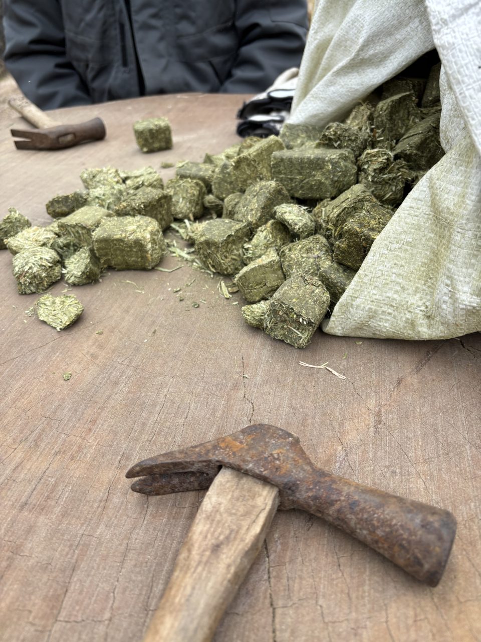 ヤギのエサがブロック状に固まっていてこのままではヤギが固くて食べれないので、トンカチで叩いてほぐしました。エサをもっていると自然と寄ってくるヤギが可愛かったです♡