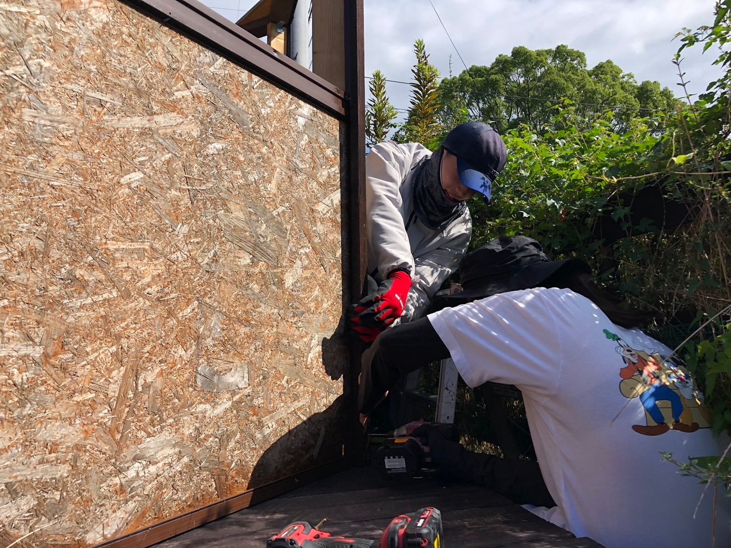 お昼ご飯を挟み、午後も小屋作りの続きを行いました。台風の後ということもあり日差しが強く、休憩を挟みつつ頑張りました。初めてのDIYの体験だったため、難しい部分も多かったですが、とても楽しかったです。小屋の完成が楽しみです。