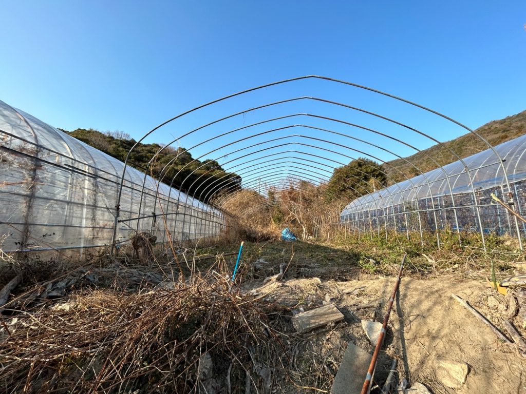 午後は1日ぶりにビニールハウスの解体作業。ラチェットレンチという新しい工具をUボルトを回すに使いました。これは個人的にボルト回し界の大発明だと思います(笑)解体作業中はどこの棒、ネジを外すのか考えながら作業しなければいけないなと賢さんを見ていて思いました。これからも、残り少ない江田島での生活を楽しんでいきたいです!