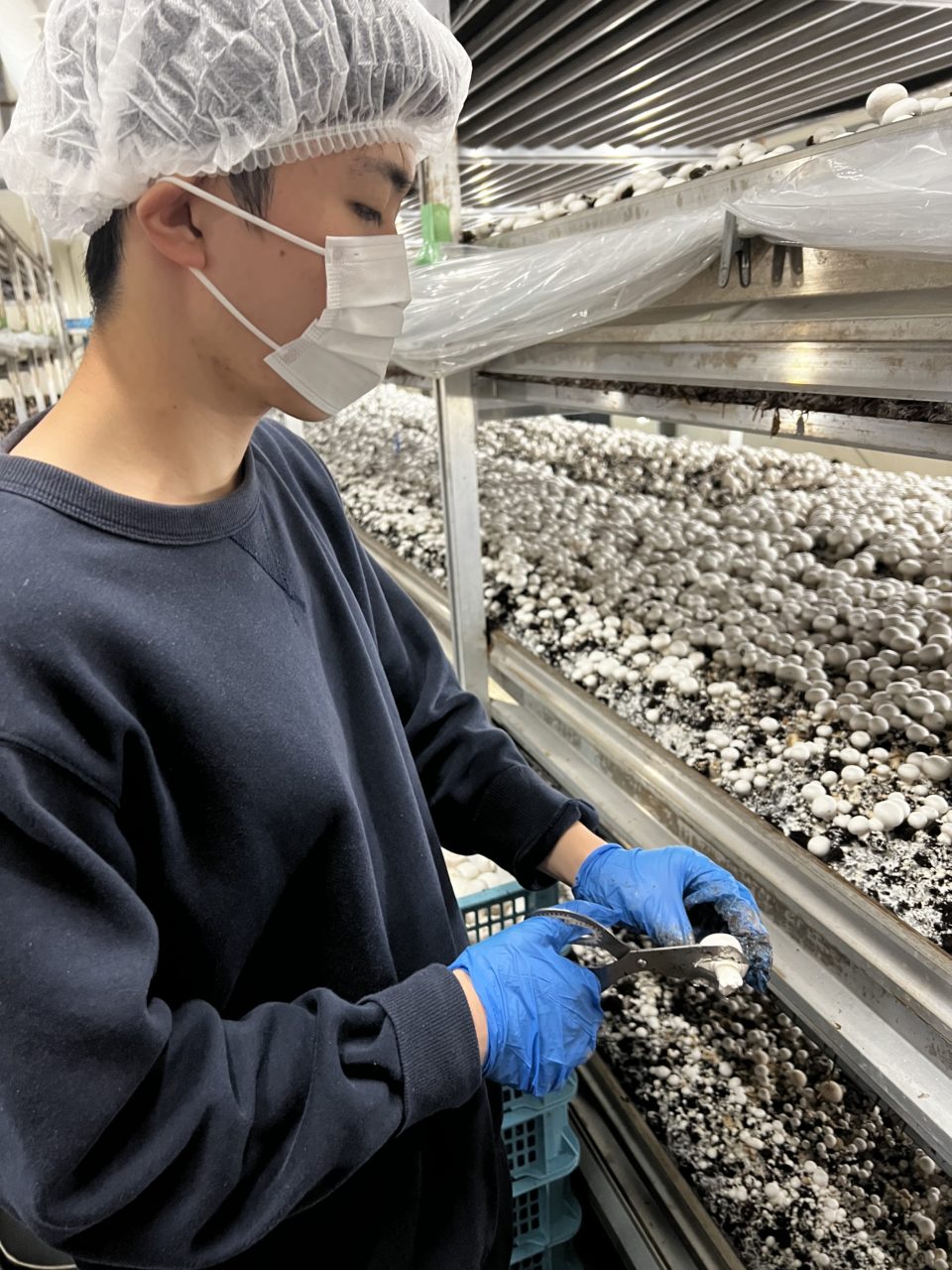 今日は午前中にマッシュルームの収穫をしました。以前1回収穫をしましたが、今回は量が多く、質の良いマッシュルームだったので慎重に収穫しました。キノコに限らず、普段スーパーに並んでいる食品が手間暇かけて作られていることを実感し、食べ物に対して今まで以上に感謝して食べたいなと思いました。午後は、草刈をしました。鎌での草刈はこれまでで何度もしたことがありましたが、機械を使ったことは一度もなかったので、怪我しないように気をつけて作業しました。その後には乗馬をすることができ、すごく充実した1日になりました。