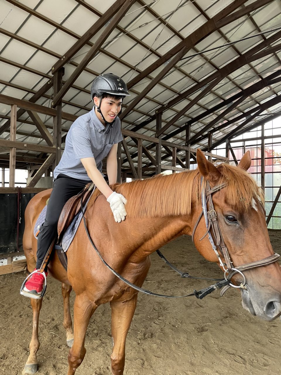 馬房掃除が終わって、午後には乗馬の体験をさせてもらいました。並足の状態でもかなり揺れが激しかったですが、楽しいひとときを過ごせました!