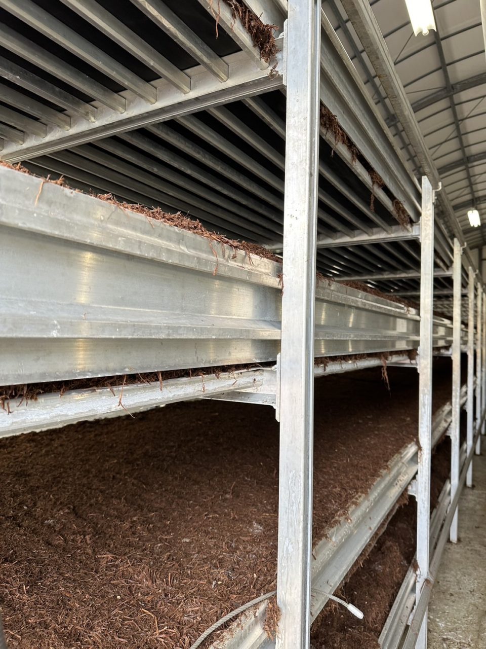 2人ずつに分かれて、1つののグループは馬房掃除と餌やり、もう1つのグループはマッシュルームの土を敷き詰めました!