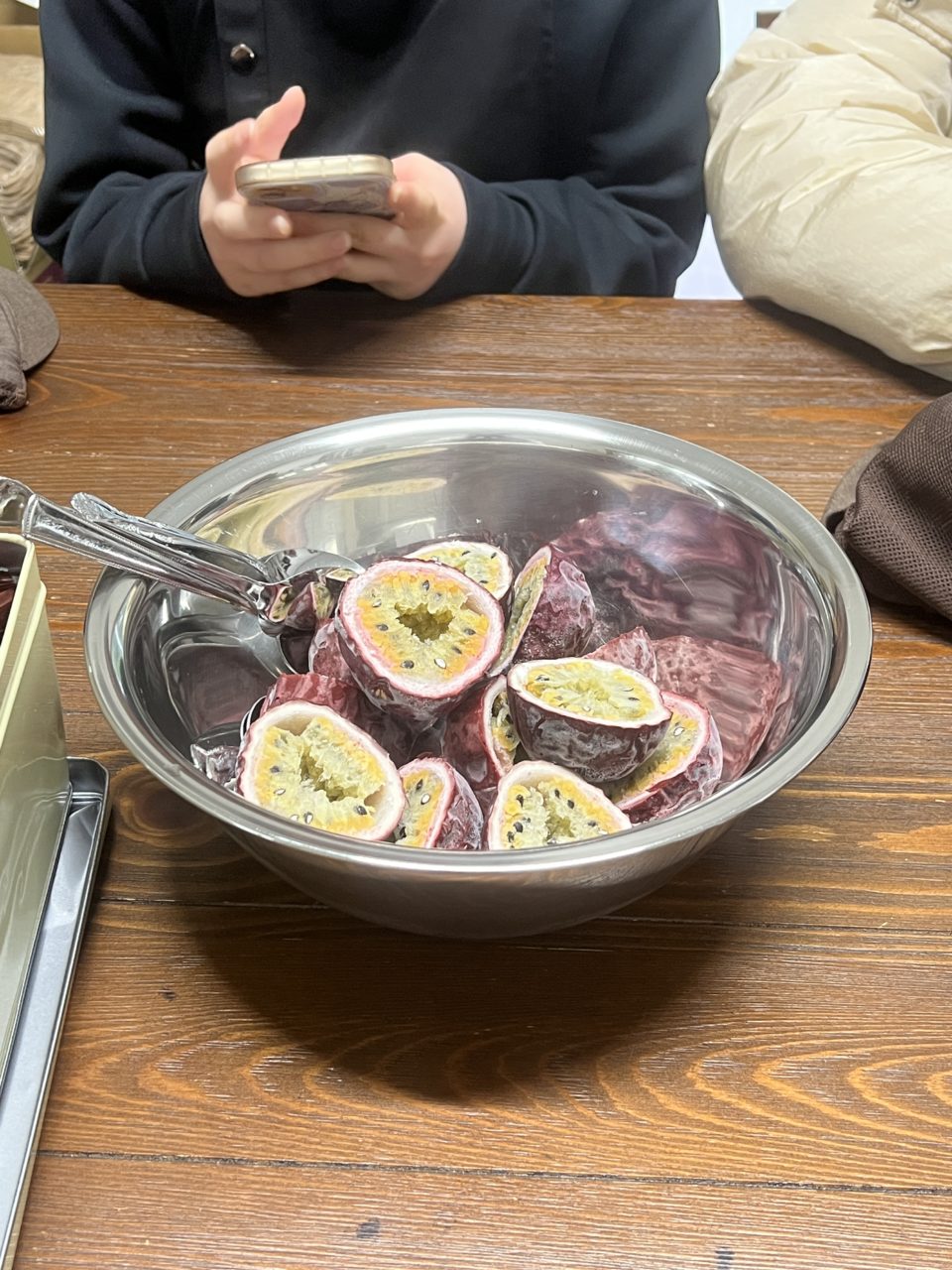 お昼には、冷凍のパッションフルーツをいただきました!食べるのは人生初!トロピカルな味わいとつぶつぶの食感が新しく、とても貴重な経験でした!🏝️