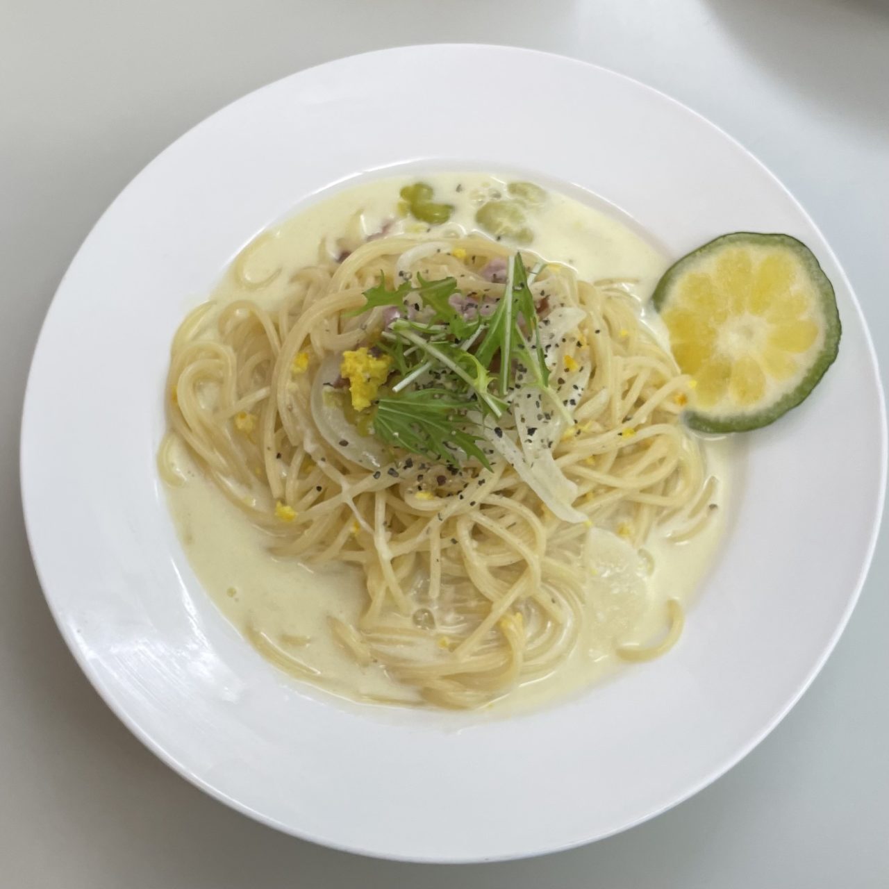 お昼ご飯は“ゆいカフェ”というカフェで島みかんクリームパスタを食べました🍊喜界島で作られたみかん「フスー」を使用したオリジナルパスタで、とっても美味しかったです!!