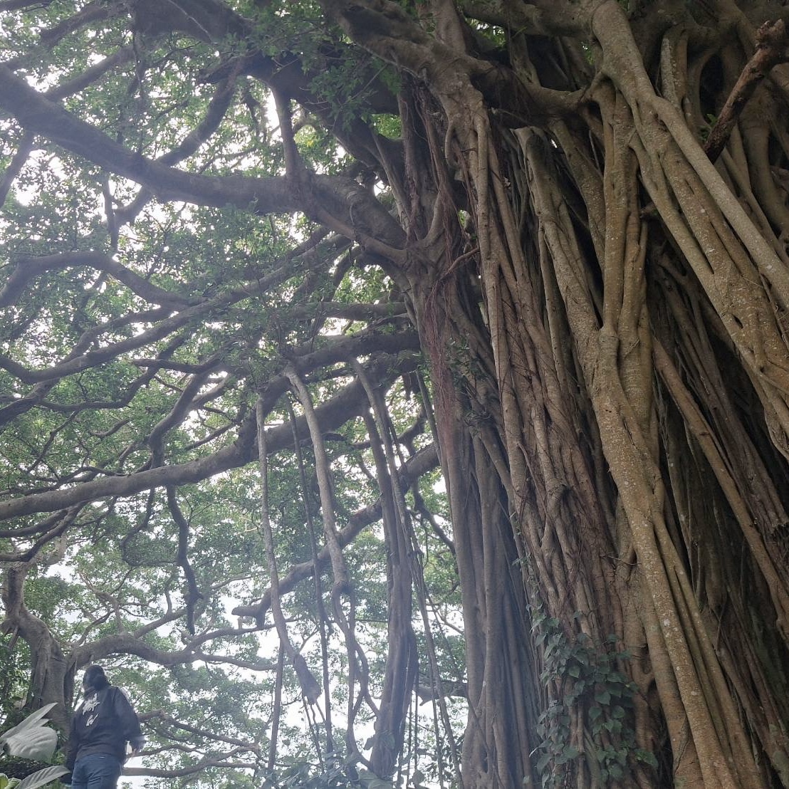 ハワイで見るような大きな南国の木。別名”歩く木”だそうで、枝から多く生える赤髪のようなファサファサした気根は、いずれ枝のようになり、その枝が根や幹になることができます。
