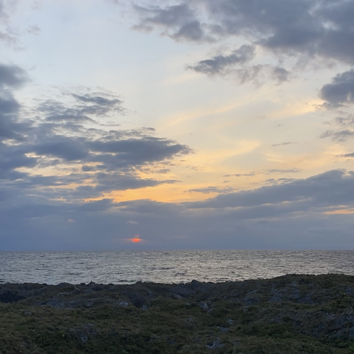 そして仕事終わりに、園田さんのお子さんたちも一緒に、夕日を見に海岸に行きました!沈む頃には雲がかかっていたのですが、隙間から真っ赤な太陽が少し見えてとても綺麗でした🌆✨️一昨日に引き続き、さくな(長命草)もたくさん摘みました🌱