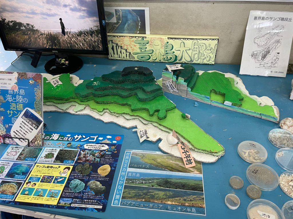 まず、サンゴ礁科学研究所では喜界島の成り立ちについて学びました。喜界島がサンゴ礁でできた島だということは伺っていましたが、その中でもサンゴ礁段丘という階段状の地形を持つ島は世界中をみても珍しく研究者の関心を集めていること、サンゴの化石の下に不透水層があることで段丘の崖から地下水が湧き出し、その周りに人が集まり30以上もの集落や港ができていった歴史があることを学びました。