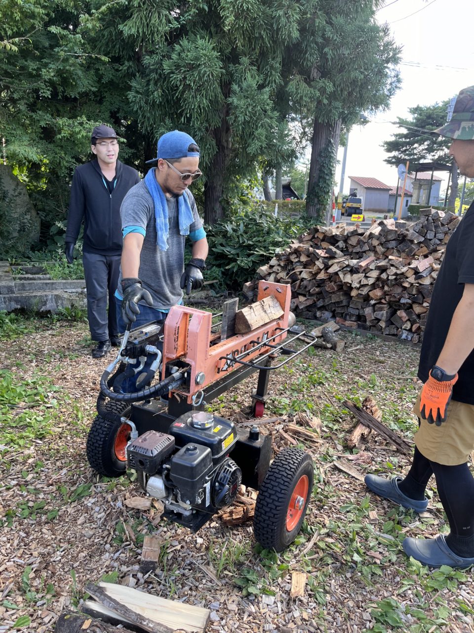 この機械は、ガソリンを入れることでエンジンが入って、鉄の棒の中に入っている油を圧縮させることで、薪に強い力を加えることができます。7人いても作業は大変だったけれど、最後の方は皆んなコツを掴んで効率よくできた気がします!