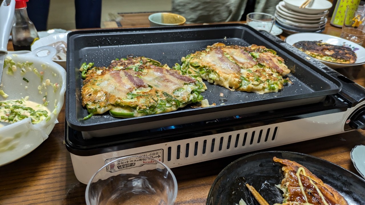 夜ごはんは関西出身の参加者監修のもとお好み焼きをしました。せっかくたくさんピーマンを頂いたので生地に一緒に入れたのですが、思っていたよりもとてもおいしかったです!!