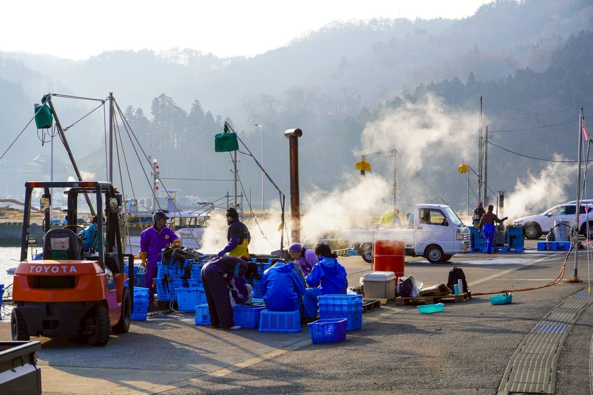 漁師さんは朝3時頃に出航し、6時頃に戻ってからも、茹でる・冷やす・選別・梱包と作業が続き、長い日には夜7時頃まで作業をされるそうです。