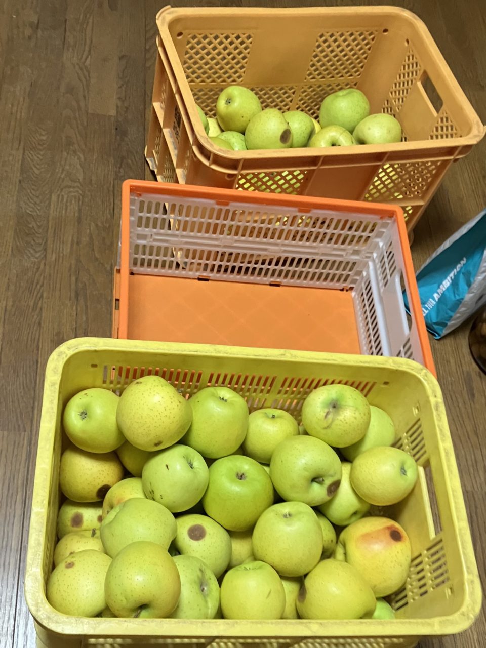 夜には昨日の大量ムール貝に引き続き2籠分頂いた、ウニの殻を肥料に用いたりんごを使って様々な料理を作りました。色々な方から多くのものを頂けて最高です!