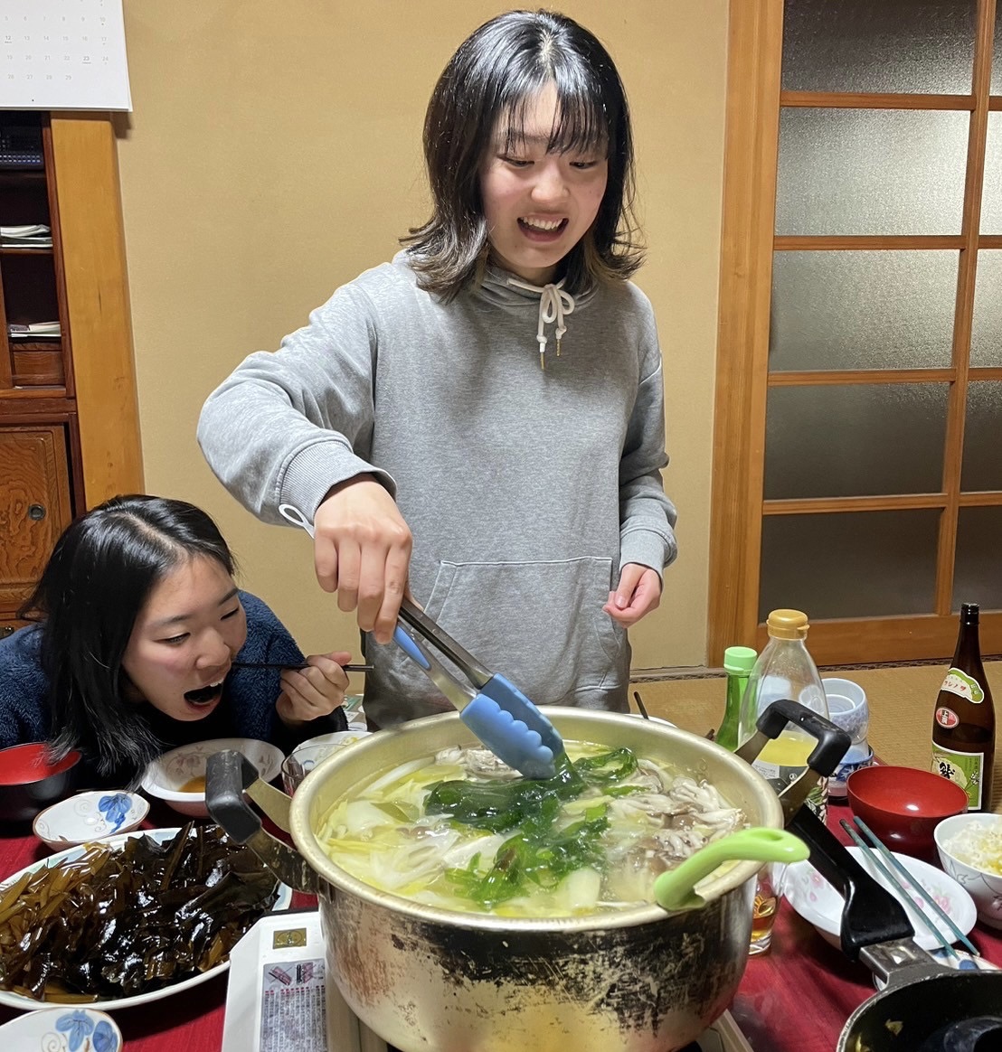 初めて、装備を付けて海に潜りました。昨日からの雪が降り積もっていて、なかなか見ることのできない絶景でのダイビングとなりました。ドライスーツの着方もだんだんと慣れてきて、一人で着ることができる部分が増えてきました。初めて背負う装備はとても重く、陸上ではふらついてしまう人も見られました。ドライスーツを着ていても顔は寒くて、海水につけるのは少し怖かったです。午前中、基本的な動作を習得するため3時間ほど足の着く場所で潜った後、地域の食堂で美味しいお昼ご飯を頂きました。ラーメンと海鮮丼を破格で味わうことができて幸せでした。夜は採れたてのワカメをしゃぶしゃぶで食べました。今まで食べていたワカメとはまるっきり違う、シャキシャキとして鮮やかな緑色で、そのおいしさに感動しました。夕食後はダイビングライセンスの筆記試験を全員でクリアして、充実した一日となりました。明日、深くまで潜るのが楽しみです。