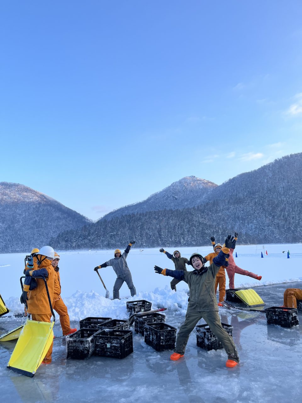 作業日4日目です。今日は一日中、雪でブロックをつくりました。このブロックはイグルーやアイスバー、通路の脇にある塀などをつくる時にたくさん必要になります。これまでも3000~4000個ものブロックをつくったそうです😳そして、今日は全部で600個のブロックをつくりました。雪に水をかけてシャーベット状にしたものを使うことがポイントだそうです!雪をサンテナ(ブロックの型となる黒いカゴ)に詰める人、運ぶ人、サンテナをひっくり返して並べる人に分担して作業を行いました。体力の使う作業でしたが、集中してゾーンに入って作業をすると楽しくなってきた!と言っている人もいました!