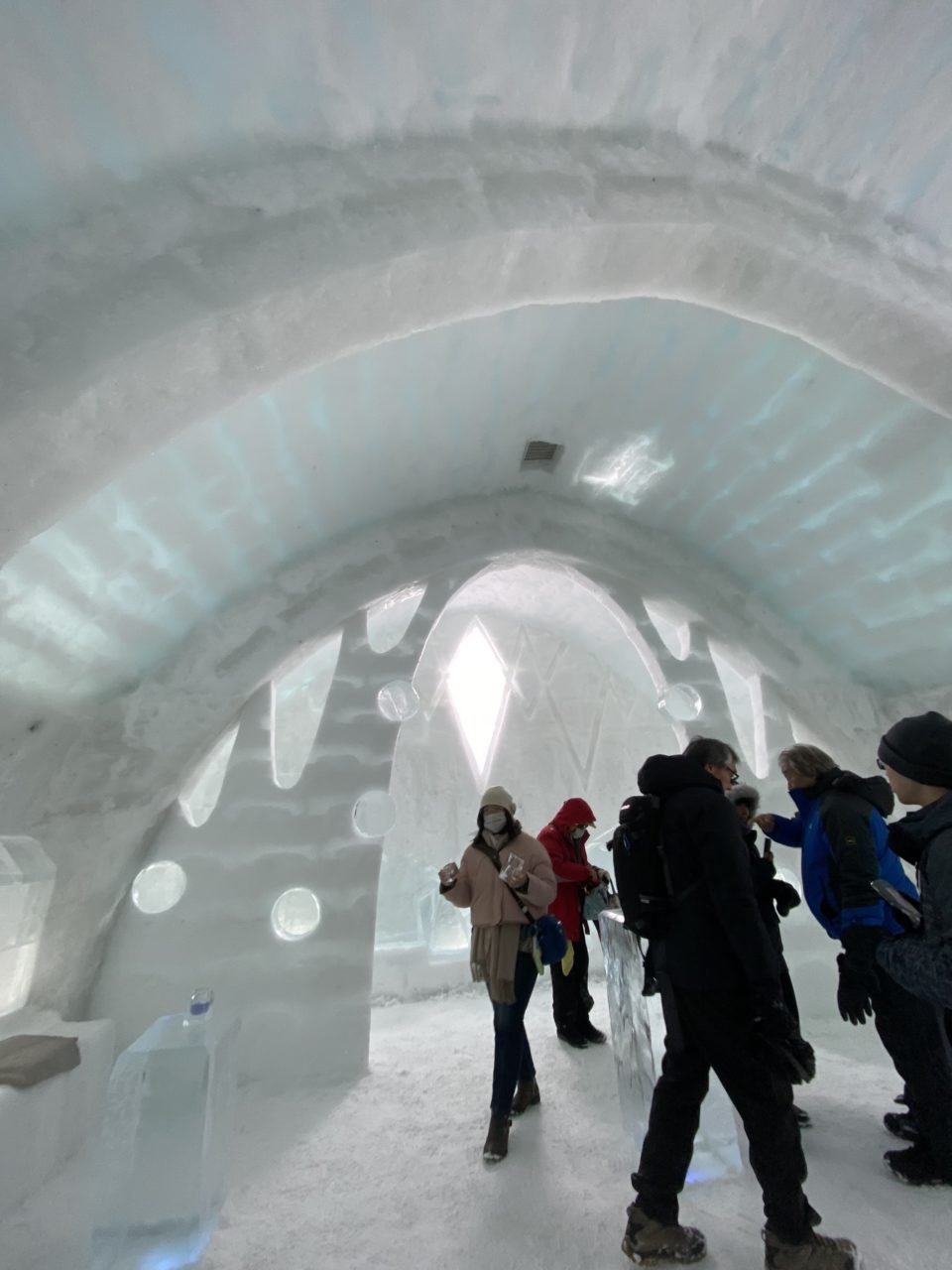 建設に携わった方にお話を聞き色々なことが明らかになりました。まず天板の氷がどう支えられてるのかという疑問です。それは氷の質とガッツにより支えられています。私は建物の氷は湖から切り上げられてると思っていましたが、実は雪から固められた比較的軽い氷が使われているみたいです。それを水でバシャバシャになった床をセメントのようにしてくっつけるみたいです。この時、氷同士が接着するまでの期間はしたから支える必要があるみたいです。大変そうだ、根気がいりますね!