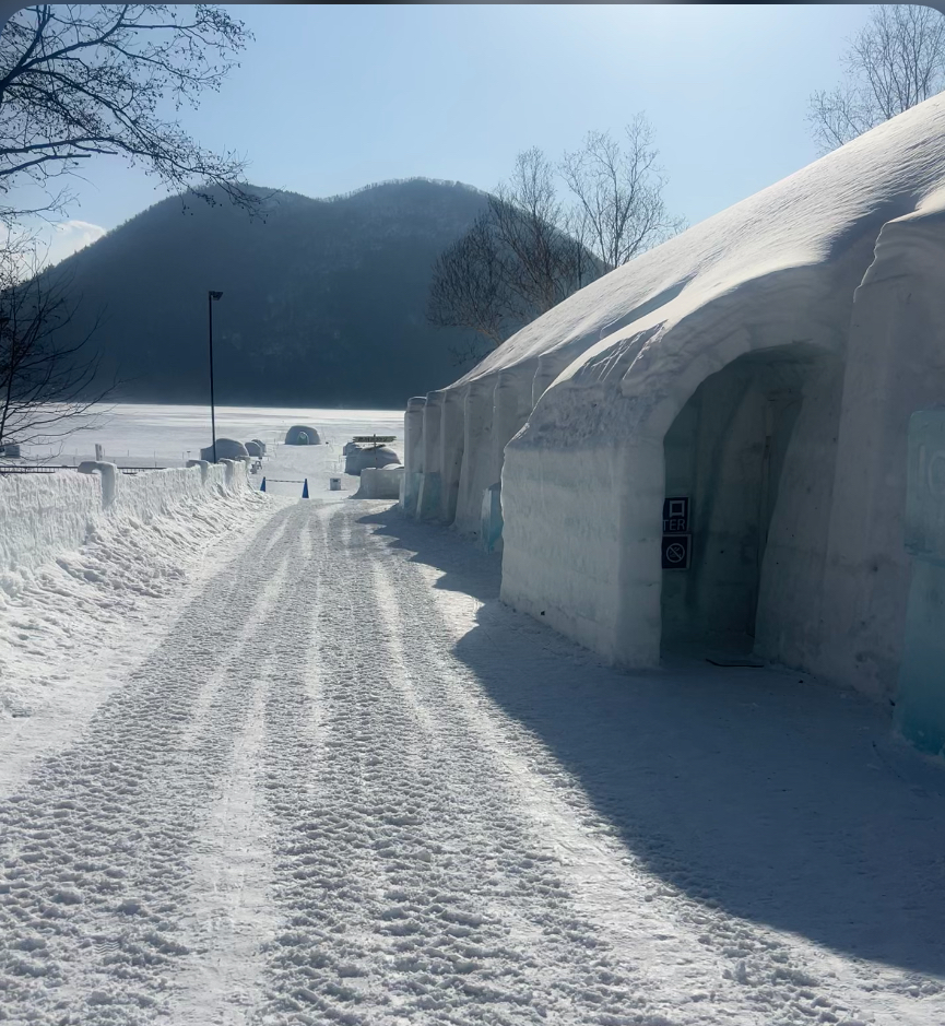 今日も雪が降っていたため然別湖コタンが一面真っ白になり、奥のくちびる山も全く見えなくなっていました。晴れている日との比較写真を載せておきます。
