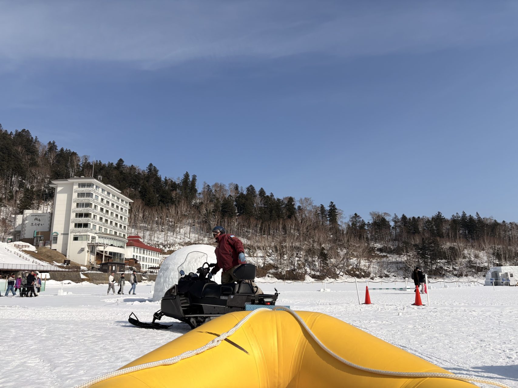 朝いちばんで、一緒に湖の上のスノーラフティングへ。
