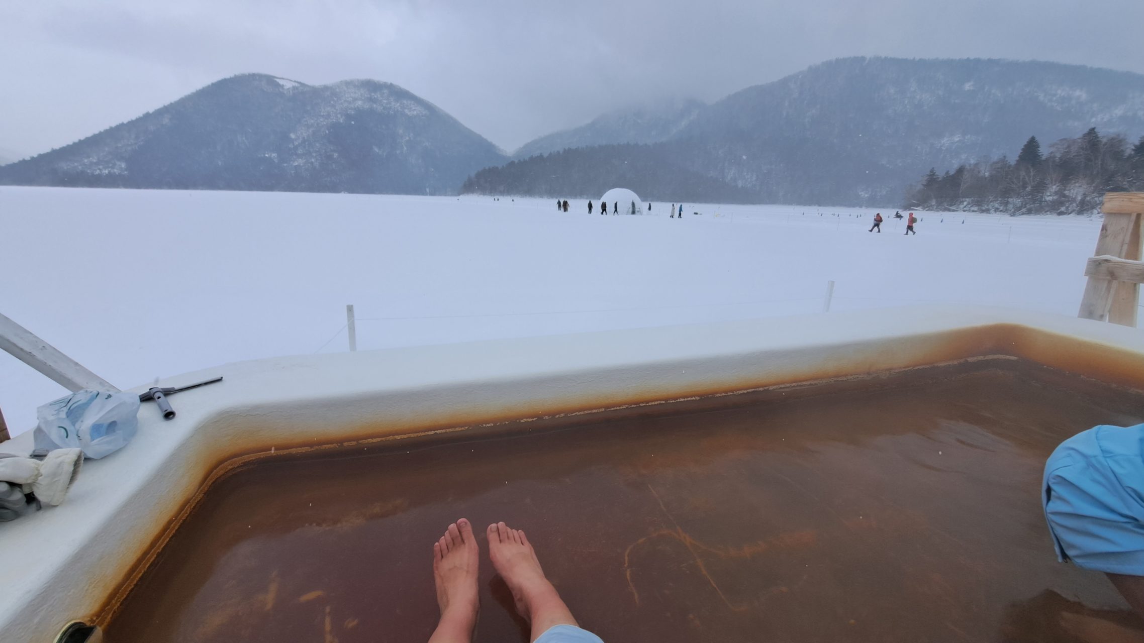 今日は活動5日目で、もう折り返しです!今日は氷上足湯と露天風呂の受付を担当しました!湖の上での露天風呂は今まで見たことなかったので、迫力が凄かったです。源泉からホースで温泉を引っ張ってきていたのは感動しました!足湯に入ったのですが、氷点下の気温で冷えきった体が温まり、見える景色も最高でした!入りに来てくれたお客さんも温まったのかみんな笑顔でした!明日はお湯花火をする予定なので、早めに寝てまた早朝から頑張ります!