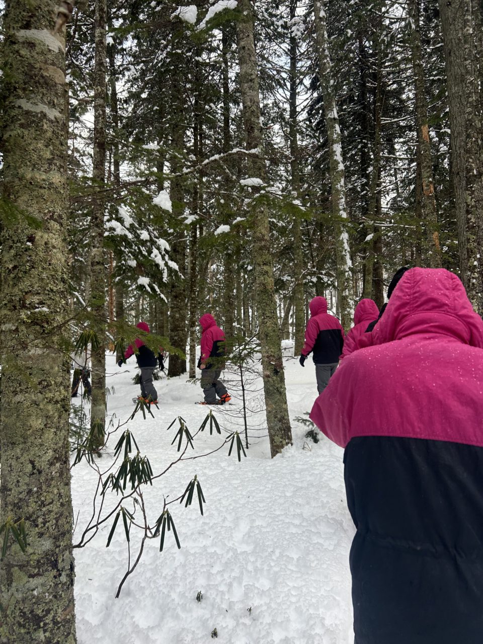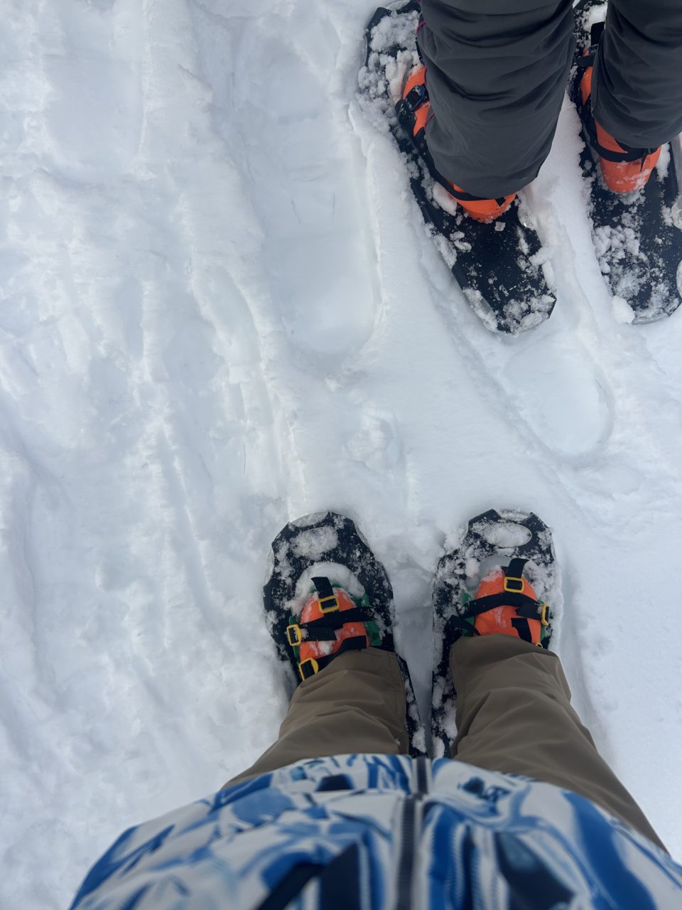 その後は、森の散策ツアーに参加しました。雪の上でも沈まない特別な靴、スノーシューを履きました。ちょうど雪が降った後だったので、フワフワの雪の上を歩けました🚶