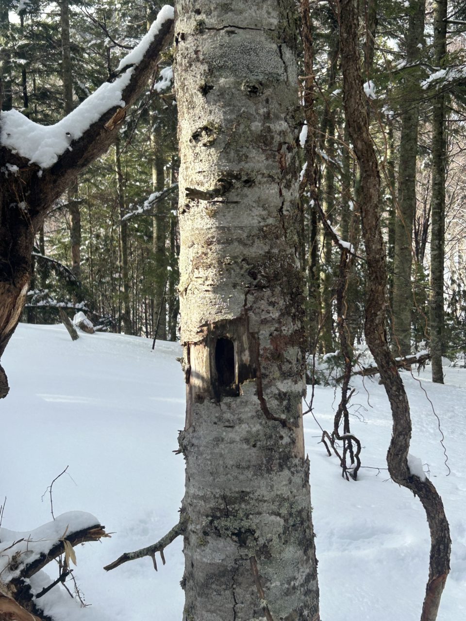 落ちている葉っぱから、モモンガ食べた後だとわかったり、キツツキの穴を見たりしました。キツツキの穴は、想像より大きくて驚きました。