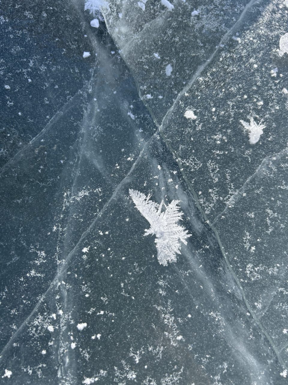 天気が良かった上に、冷え込んだため、神秘的な光景を見ることが出来ました。1枚目の写真は「フロストフラワー」と呼ばれるもので、夜の間に霜の結晶がつくられ、気温の低下とともに膨らみ花のような形になる現象です。湖上一面に広がる結晶はとても美しく、見惚れてしまいました。ひとつひとつ形が異なり、近くで見るとまた違う魅力を感じました。2枚目の写真は、蝶のような形をしたフロストフラワーの結晶です。