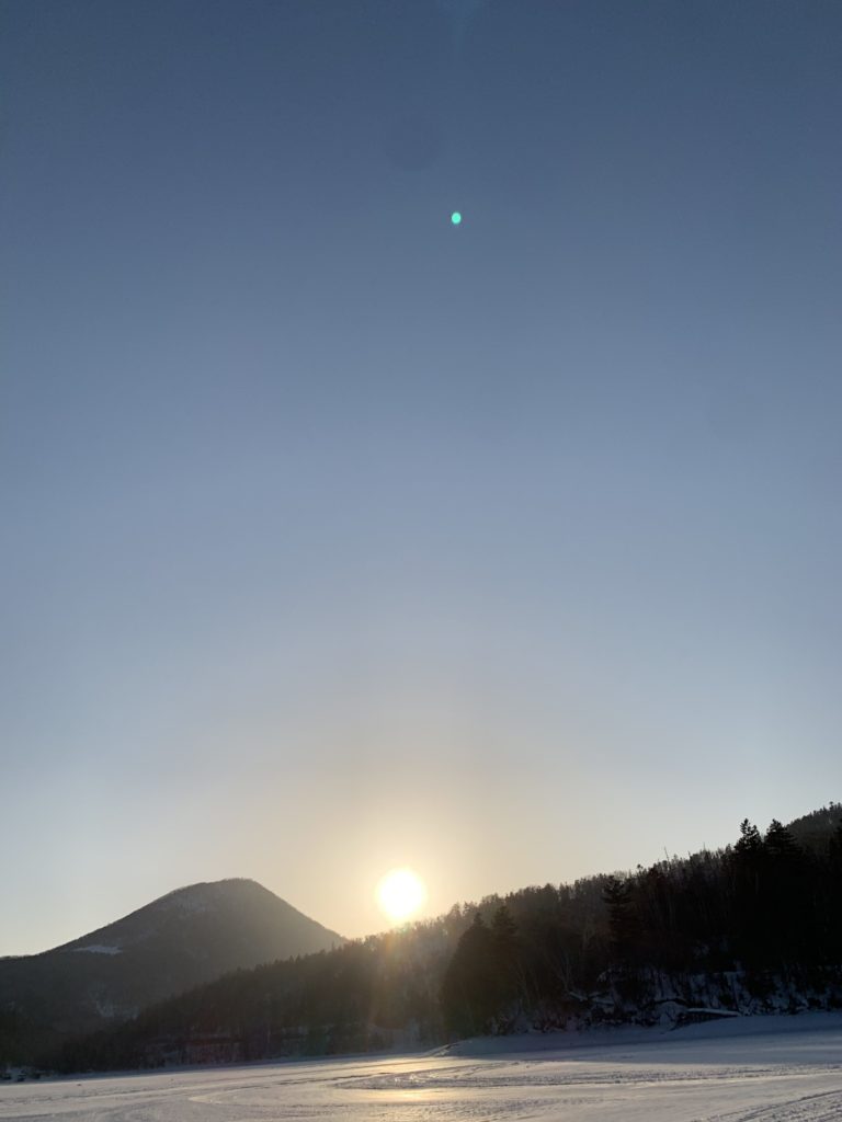 今日の天気は晴れ。気温が上がり、氷が解けているところもありました。今日はお仕事最終日でした。1日中モービルの受付の手伝いを担当しました。多くの方に来てくださり、この期間で一番忙しかったです。大変でした。ですが、仕事終わりにスノーラフトに乗らせていただきました。氷の上で見る夕日は絶景でした!!1週間近く、頑張ってきてよかったなと心から思いました。本当にあっという間でした。明日は感謝の気持ちを改めて伝えて帰路につきたいです。