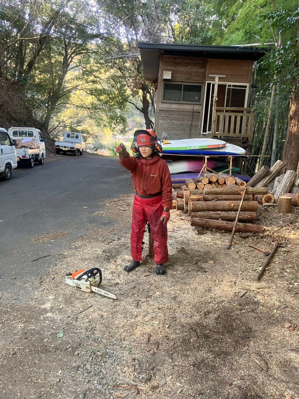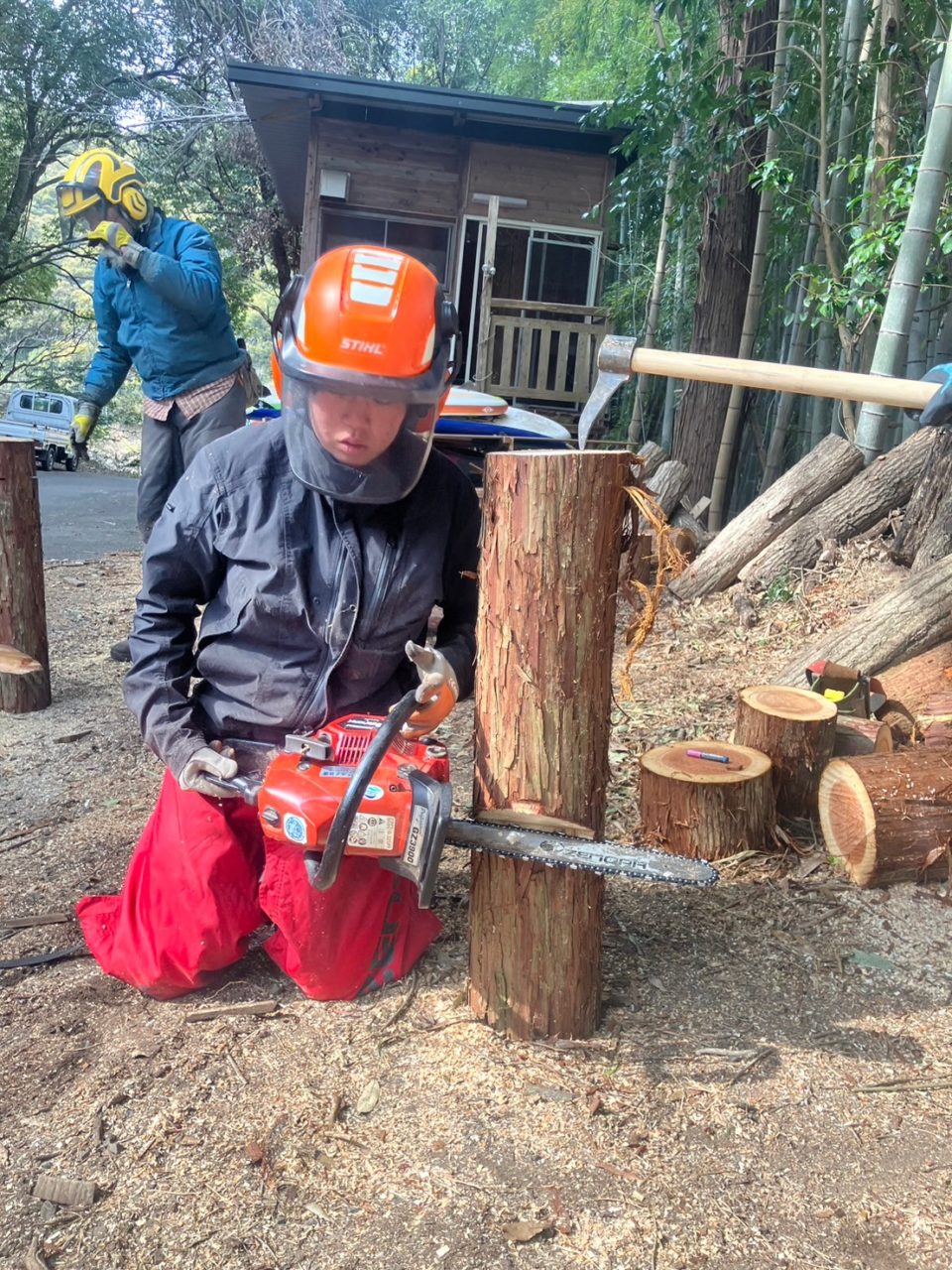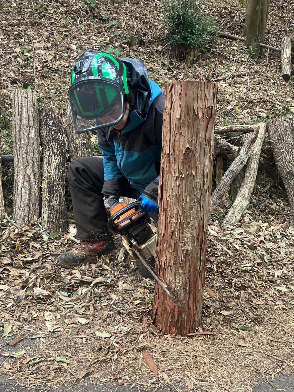 そして、チェンソー技術。進行方向への力加減やスロットルさばき、事前の測量線に沿った正確かつ大胆な切り込み。MTのクラッチ操作並みの忙しさを手元で行う。