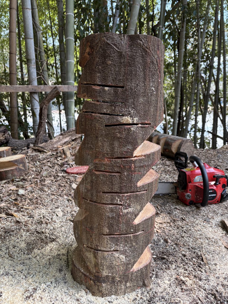 本日は、昨日に引き続き、受け口と突っ込み切りの練習を行いました。教えていただいたことやコツを思い出しながら、綺麗に作れるように取り組みました。昨日よりは綺麗な下書きが書けて、チェーンソーの向きや角度も意識して切ることが出来ました。そのため、受け口は下書き通りに切ることが出来るようになりました。しかし、突っ込み切りはまだまだ上手く切ることが出来ないので、昨日と本日の反省を活かして、これからの作業に取り組んでいきたいと思います。午後は、イベントに参加をして、聖さんから自伐林業に関係する様々なお話を聞くことが出来ました。