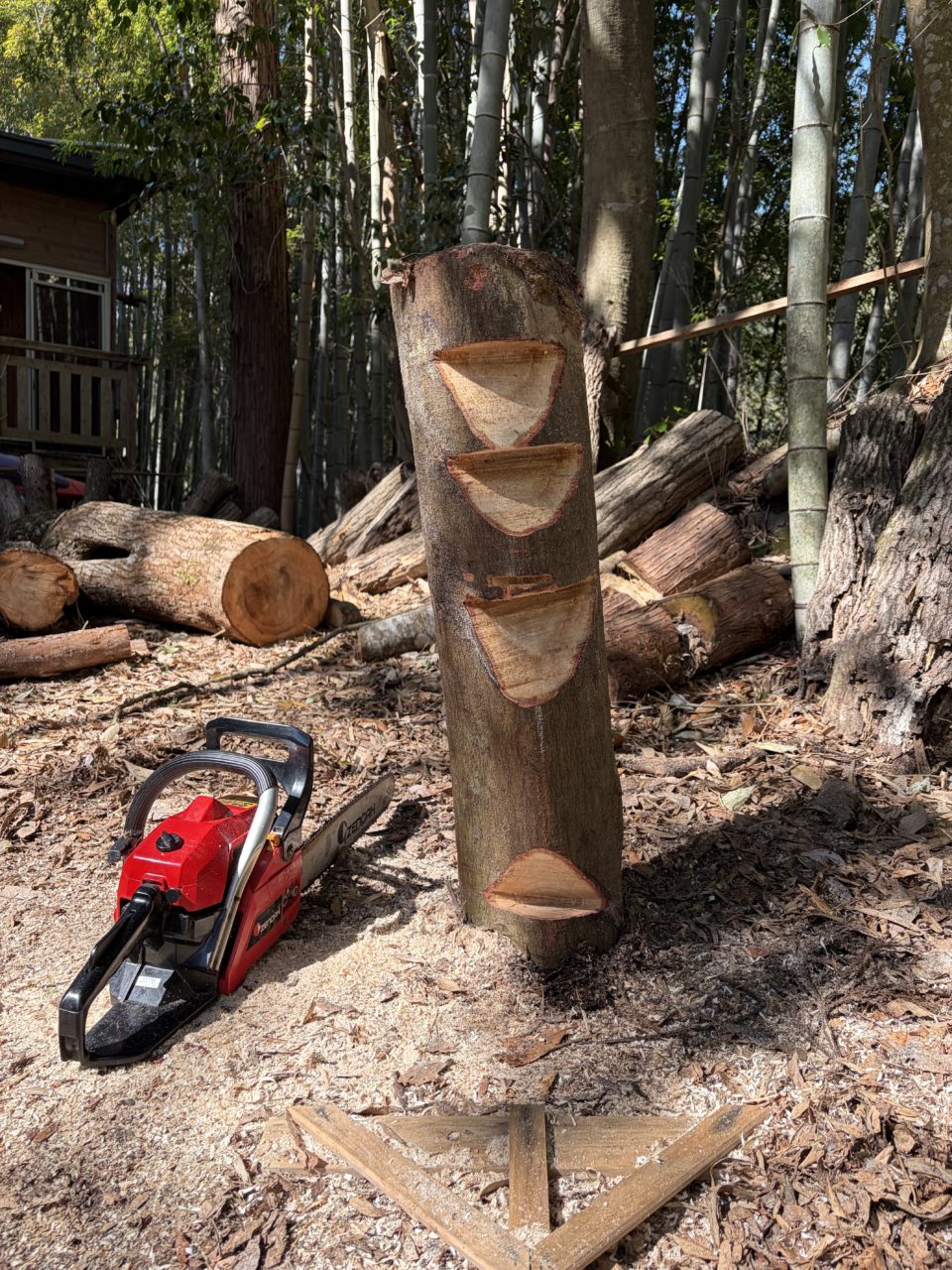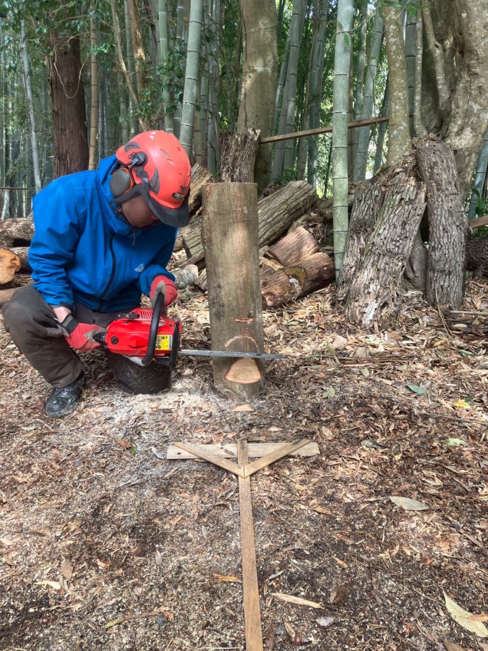 受け口の練習した後は、突っ込み切りの練習をしました。こちらも、チェーンソーの角度や向きがとても重要な作業のため、回数を重ねて、向きや角度を覚えていきました!