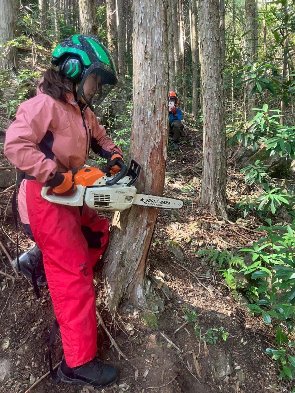 午前中は去年ECOFFに参加されていた方が木を切るのを見学しました。間伐を行う場合は周りに木が残っている状態で切らなければならないので,倒す方向が想定よりも少しでもずれると他の木に引っかかってしまってなかなか倒すことができず、とても大変だということを実感しました。チェーンソーが使いこなせれば木を切れるようになると思っていましたが、全くもってそんなことはなく、安全に倒すためにロープをかける技術や知識、臨機応変に対応する力などが必要で、1人でどんな状況にも対応できるようになるにはかなり経験を積まなければならないと感じました。