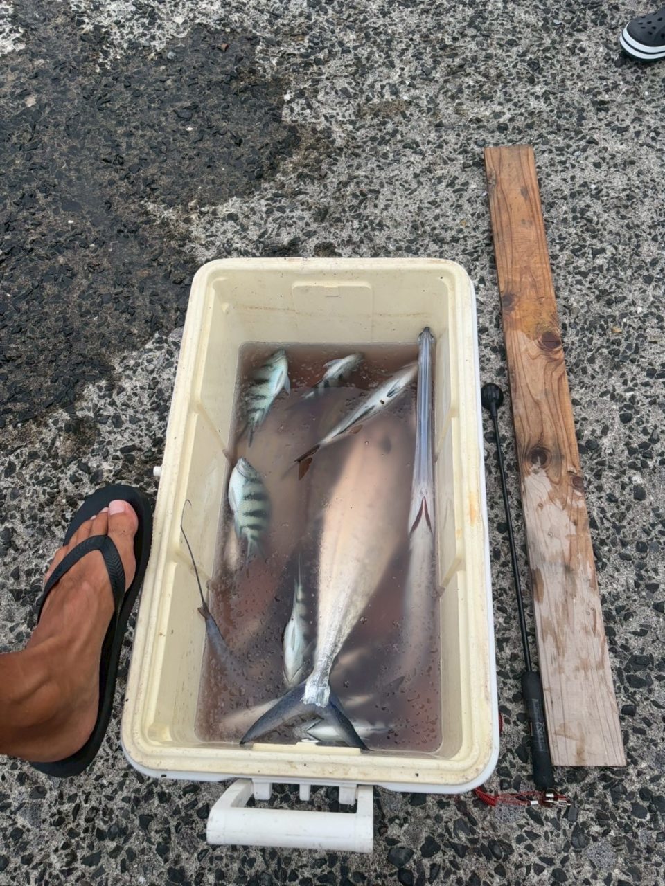 午前は昨日の草刈りの続きを行いました。熊手の使い方や集め方の感覚を掴み、効率を上げて取り組むことができました。作業終わりの地点からの景色は、ジブリ映画『紅の豚』の秘密基地のようでした😊お昼頃から島の子供達と海水浴で親睦を深めることができ、とても嬉しかったです。また、昨日習った3枚おろしの腕を上達することができました。骨は硬く捌き方は難しかったですが、包丁の使い方や手の置き方で変化することが楽しかったです。午後は島の漁師さんのご厚意で釣りを教えていただきました。釣りは撒き餌で引き寄せられた魚を竹竿で釣る方法です。ビンゲエ(オヤビッチャ)を釣ることを目標としました。様々な魚を数十匹釣ることができました。ビンゲエは背びれが鋭利なため、釣り針から外す時に怖かったですが、タオルや軍手で安全に外すことができました。体長が30cm程のソウシハギをボランティアメンバー全員釣ることができました。餌のイカを釣る前に取られてしまうことが多く釣ることに苦戦しました。そして内臓に毒があることに驚きました。しかし漁師さんの適切な処理で切り身にしていただきました!漁師さんの家に招いていただき、ビンゲエのオヤビッチャの唐揚げなど豪華な料理を振る舞っていただきました😄とても美味しく、ご夫婦との会話が楽しかったです。島の方々と親睦を深めながらお役に立てるよう頑張りたいです😊