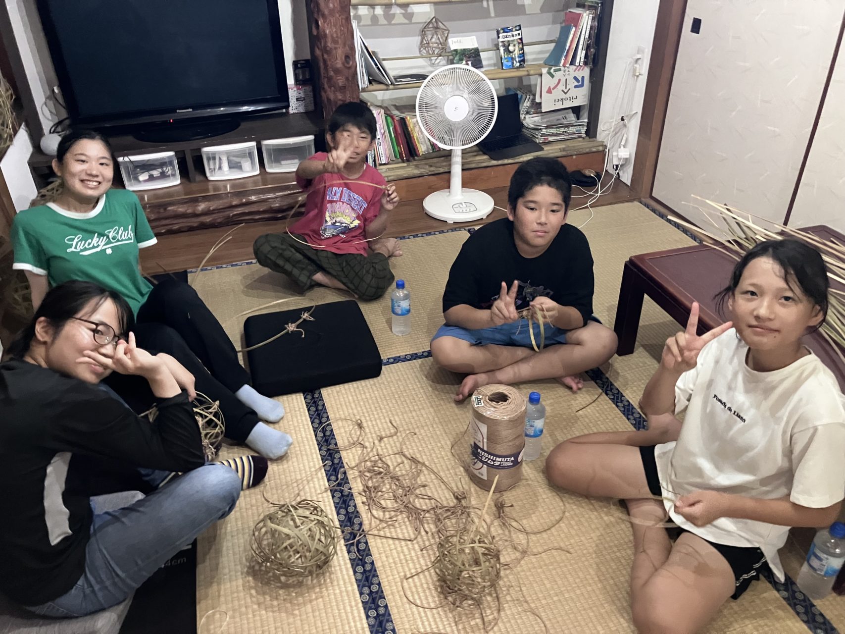 午前は前日からの続きの竹まりづくりを行いました。そして島でお世話になった方々と港でお別れをしました。とても悲しかったですが、また来たいなと強く思いました!フェリーの発着時に島の方々が協力しあって先導していたところが印象に残り、大迫力でした!午後は島の子供達3人も加わり楽しく竹まりづくりを行いました。大小様々な形の竹まりを作ることができました😊夜は盆踊りの準備とお祭りをしました。島の方々と沢山会話を楽しみ、盆踊りをしました。ドンスの掛け声をし、セガセと返す掛け合いが楽しかったです!島の方々が優しく会話してくださり本当に楽しかったです😊オンボ岬に星を見に行こうとしましたが迷ってしまったのでリベンジしたいです!