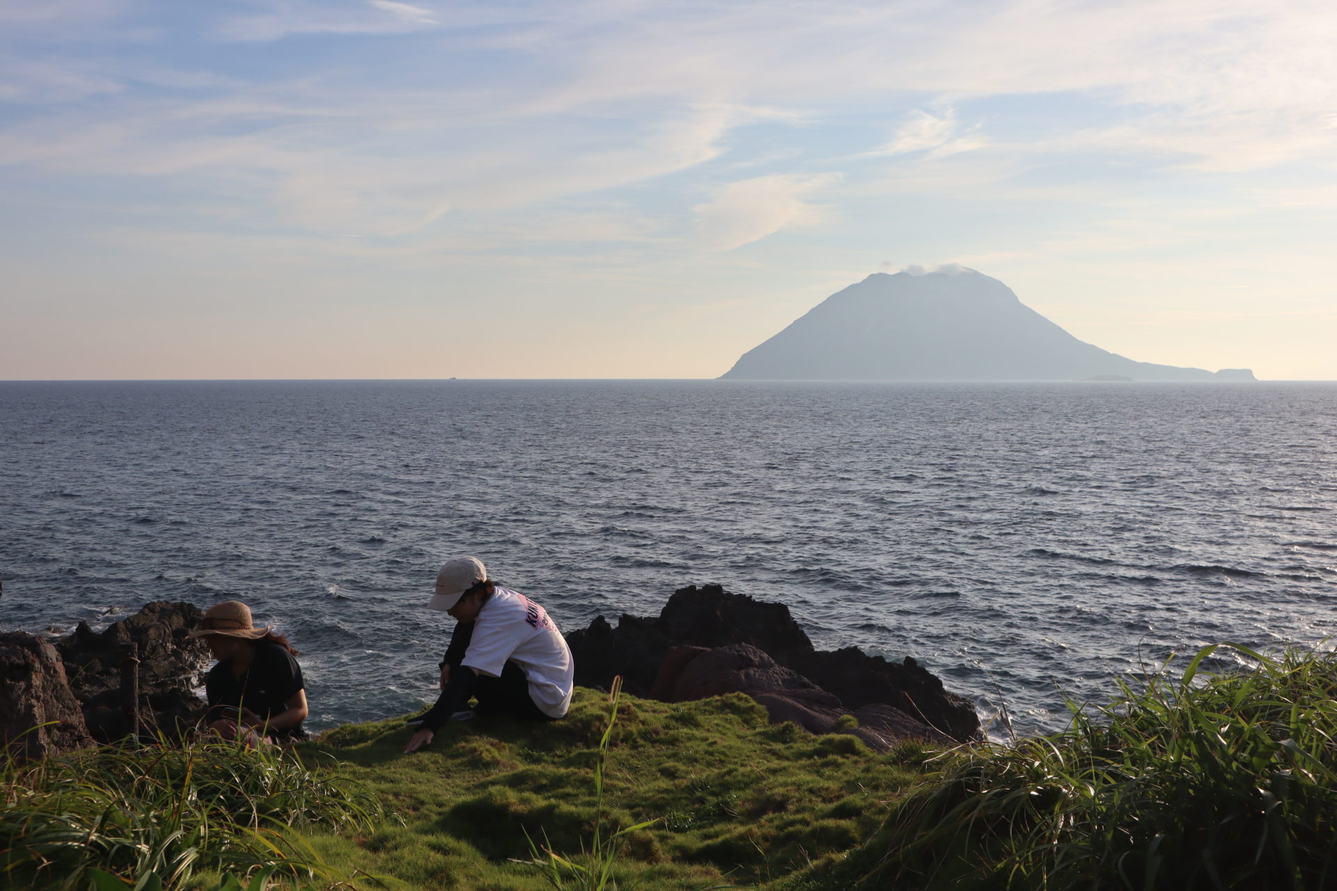 夕方からは、島の西端にあるオンボ崎公園まで、サイクリングをしました。電動自転車はとても楽で、どんな坂でも簡単に上ることが出来ます。汗をかくことなく、島内をめぐって、気持ちの良い時間でした。オンボ崎では、お隣さんの三島村硫黄島を見ることができました。硫黄島には大きな火山があり、山頂からはガスも出ていて迫力満点でした。竹島と硫黄島は、過去に起きた大噴火でできた地形で、オンボ崎ではマグマが固まった岩石や、当時の噴火の規模を感じることができ、地質が好きな私にとっては興味深いものがたくさんありました。とってもきれいな場所なのでぜひ、皆さんにも行ってもらいたいです。