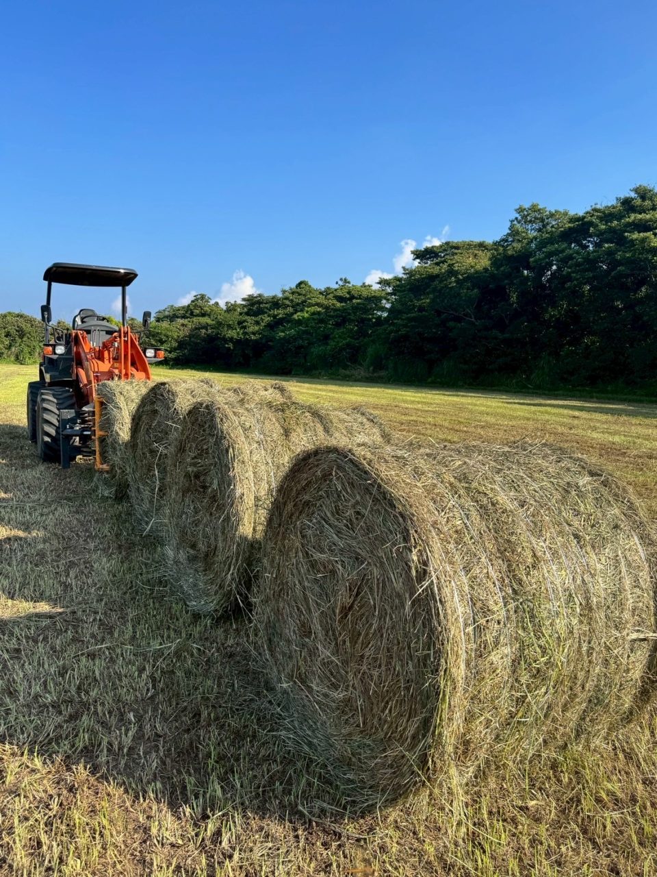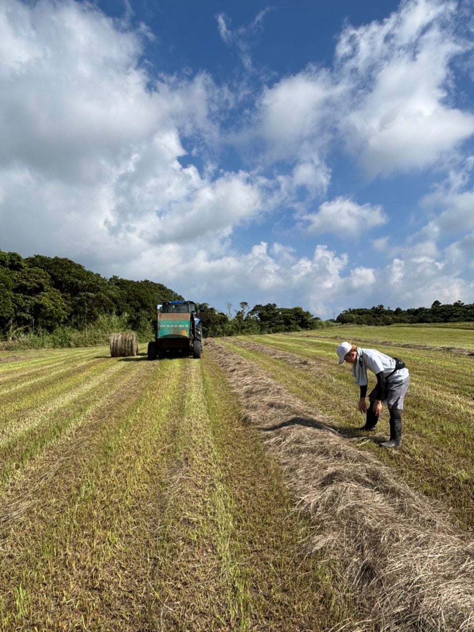 午後には牛の飼料として使われる牧草ロールを作る乾草用牧草地に行きました。乾燥ロールを作る際、丸めたロールの中にPPロープを入れる作業を 芯入れと呼びます。芯入れは専用の道具で行いますが、PPロープが垂れ白いビニールを被せる時にPPロープが絡まる可能性があるので私たちの手で修正するという作業をしました。
