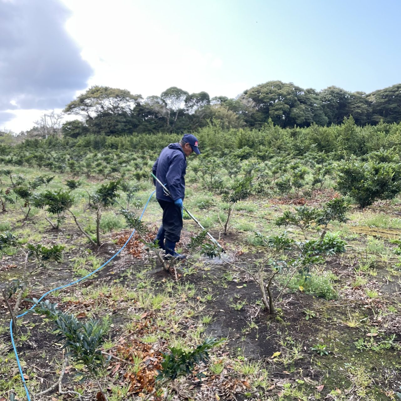 私は昨日からヒサカキ農家のみっちーさんにお世話になり、ボランティアさせていただいています。今日はヒサカキの花芽取りと畑で除草剤の散布を行いました。