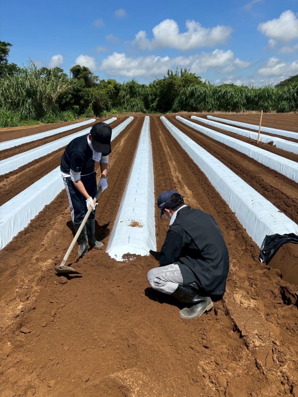 午前は今回初めての作業で、オクラ作りのための畝作りの作業をお手伝いさせていただきました。私の出身の東北では長い間少雨と猛暑で渇水状態になり、農作物にも大きな影響を与えていました。こちらでは20日くらい雨降らない時もあったけど昨日の台風などで雨が降る機会もあり、特に大きな影響はなかったというお話もあった一方、やはり台風の影響を直で受けやすく農作物がすぐにだめになってしまうこともあるそうです。今回も台風の大きな被害はなかったものの、一晩たった今日はとても蒸し暑く、農薬を撒くのにも気を使う点がありました。
