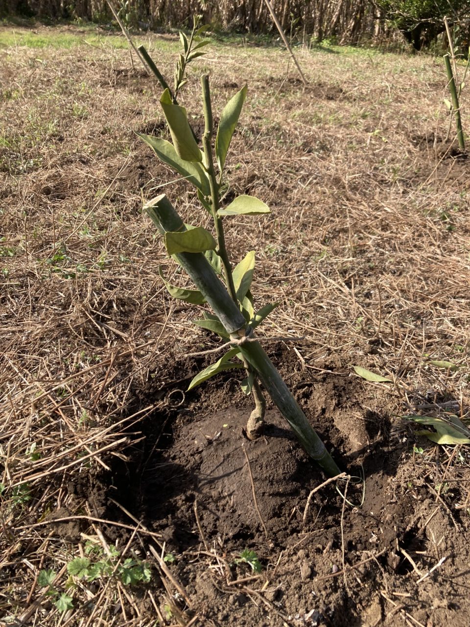 仮植えでは、ただ土を掘って植え戻すのではなく、穴を掘って水を入れ、根を広げながら接ぎ木部分まで土を戻し、再度水を与えて堤防を作ります。最後に竹で支柱を立て、ひもでたんかんの木を固定して完了します!