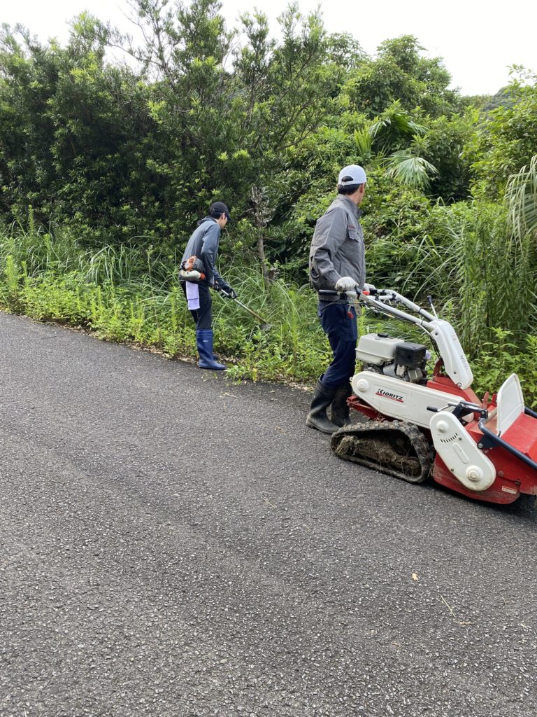 今日は午前中は世話人さんのお盆の準備のお手伝い、午後はたんかん畑の草刈りを昨日引き続きしました。たんかん畑の草刈りはガソリン式の草刈り機とチェーンソーを使って草を刈るのと枯れた木の撤去を行いました。