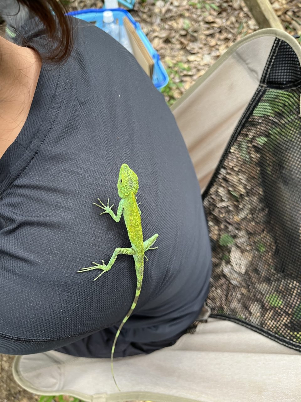 休憩中に、綺麗な緑色のトカゲを見つけました。自然の中にいると、こういう小さな発見があり本当に嬉しいです。