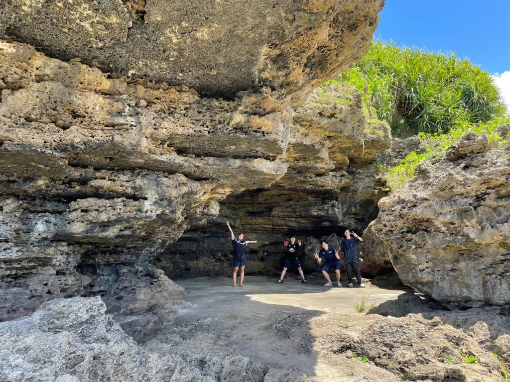 自然豊かな場所で、現地人の宮出さんが飼っているニワトリに餌やりをしたり、皆綺麗なビーサン焼けが出来るくらい海で釣りを体験させていただいたり、写真のミヤドバルでプレートの隆起やサンゴ礁を見たり、なかなか体験することのできない闘牛を見たりと、たくさん徳之島の良さを実感しました!
