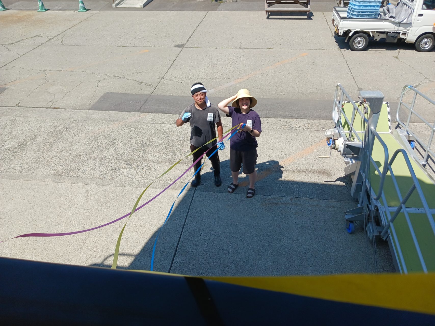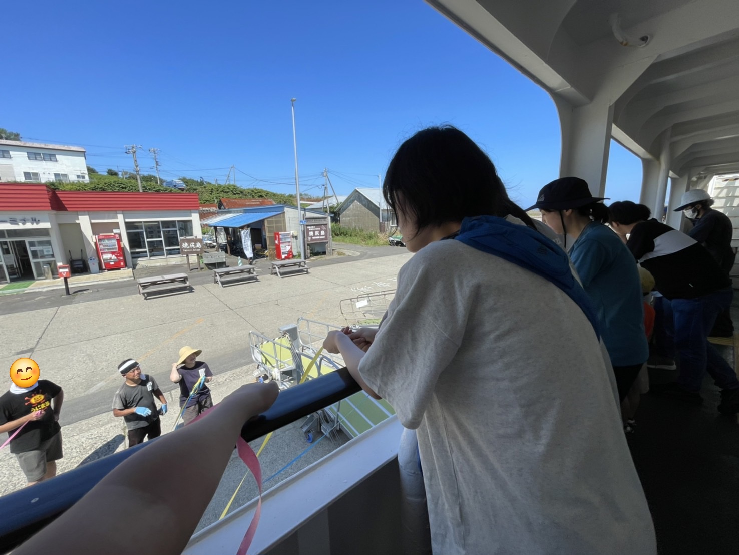 フェリーに乗り、港では最後に世話人の方と最後に過ごしたお客さんの1人が見送ってくださり、そのフェリーに最後に宿にいた勢員4人がそろいました。世話人の方が紙テープを用意してくれました。