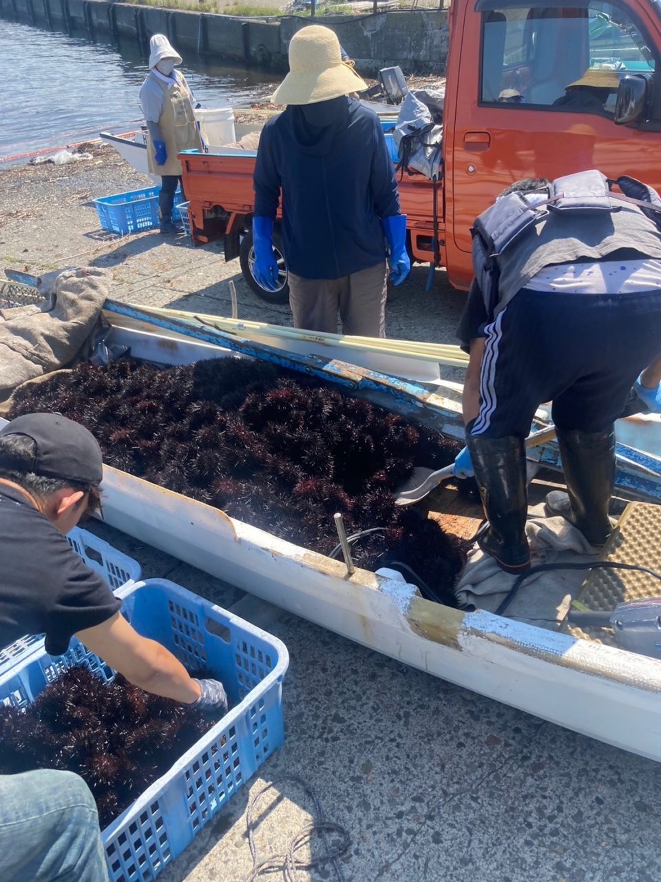 4時間後、ウニ漁師さんが海から帰ってきました。船にはたくさんのキタムラサキウニで埋まっていました。