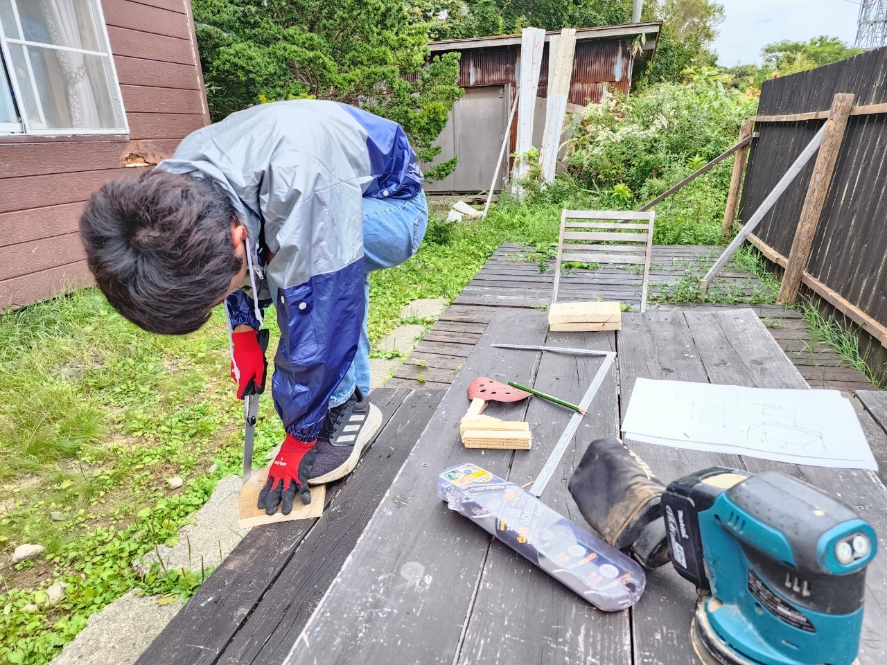 二つ目。洗面所の棚作りです。まずは板を切るところから。ここで使うのが手ノコギリ。使う時にはコツがあり、宿主の奥様であるかなさんに教えていただきました!