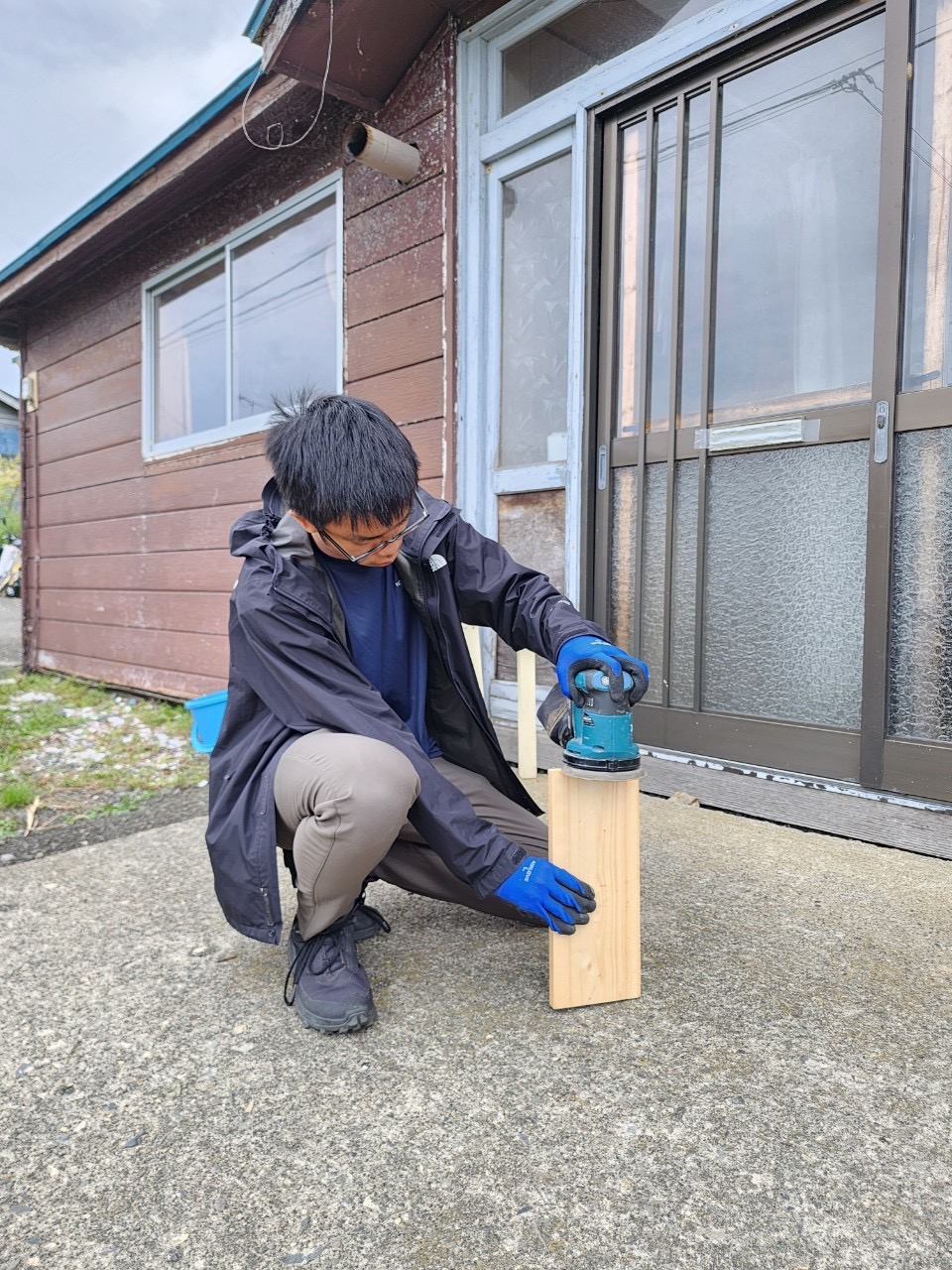 まず一つ目。靴置き場の看板は表面をツルツルにして、角を取り、下地をペイントする作業でした!